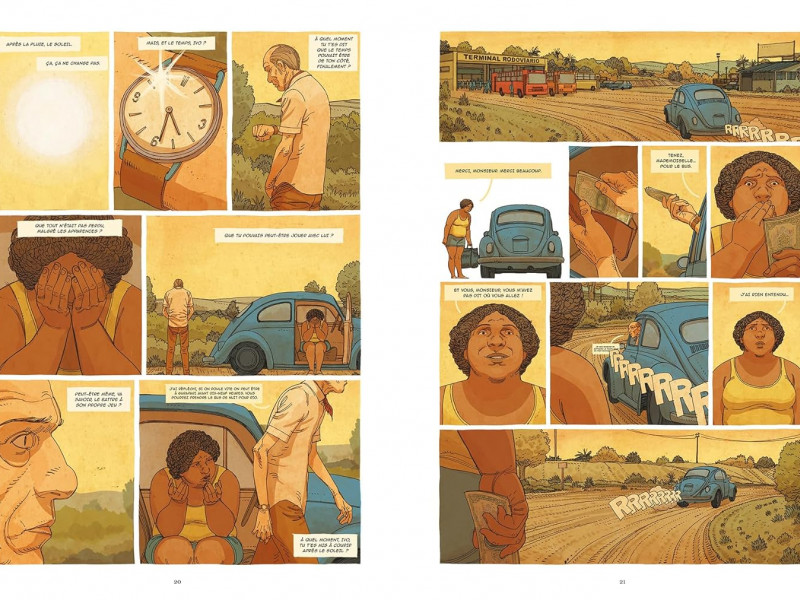 ![]() Plate-forme : Bande Dessinée Date de sortie : 23 Août 2023 Editeur : Développeur : Genre : Bande dessinée Multijoueur : Non Jouable via Internet : Non Test par Nic0078/10 Scénario et dessin : Nicolaï Pinheiro Brésil, 1989. Pedro a besoin de savoir : où et comment Ivo a disparu ? D'indice en indice, il remonte la piste. Ivo n'a jamais pu rester au même endroit très longtemps. Quand il a appris qu'il ne lui restait que peu de temps à vivre, Ivo, mécanicien taiseux atteint d’un cancer, entreprend un ultime voyage. Il rend visite aux gens qu'il a croisé et qu'il aimait. A l'annonce de son décès, Pedro est profondément bouleversé et décide de partir en road-trip sur les traces des derniers jours d'Ivo. L'album nous emmène sur les routes du Nordeste sur les traces d’Ivo, où Pedro fait des rencontres amicales et amoureuses. Il va faire quelques détours, mais sans jamais perdre de vue but de son voyage. Les personnalités se précisent, et le lien entre les deux hommes se dessine au fil des pages et des étapes qui ponctuent et s'ajoutent à son périple. Le graphisme aide d’ailleurs beaucoup à cela : les décors sont soignés et la colorisation, pleine de chaleur et de soleil, est une véritable invitation à ce voyage dans le temps et l'espace, le long de la côte brésilienne La représentation des personnages est tout aussi réussie : chacun a sa trogne propre et on ne peut pas se mélanger malgré le nombre. En plus, ce style moderne et sans fioritures est agréable, le lecteur est plongé dans l’animation de ce monde très fréquenté où tout peut arriver. Un récit choral dans lequel les époques et les évènements se répondent comme un écho, où les rencontres (la jolie Vania si attirante, Valdo le surfeur et père meurtri, Gabriel le poète chercheur, Zoé la cousine éloignée mais si proche, Dodo le pêcheur plein de sagesse...) sont simples et lumineuses. Comme dans son album précédent, "Lapa la nuit", Pinheiro tisse une histoire à plusieurs trames, humaine et à fleur de peau, dense et dépaysante. Construit comme un jeu de pistes, ce double récit va être la rencontre de deux générations et d’une galerie de personnages hauts en couleur. A lire si vous aimez « Daytripper » de Fabio Moon et Gabriel Ba, visiter le Brésil en restant assis, les histoires douces-amères. VERDICT-Un savant mélange de douceur de vivre, de relations familiales compliquées et l'espoir au bout du chemin. |